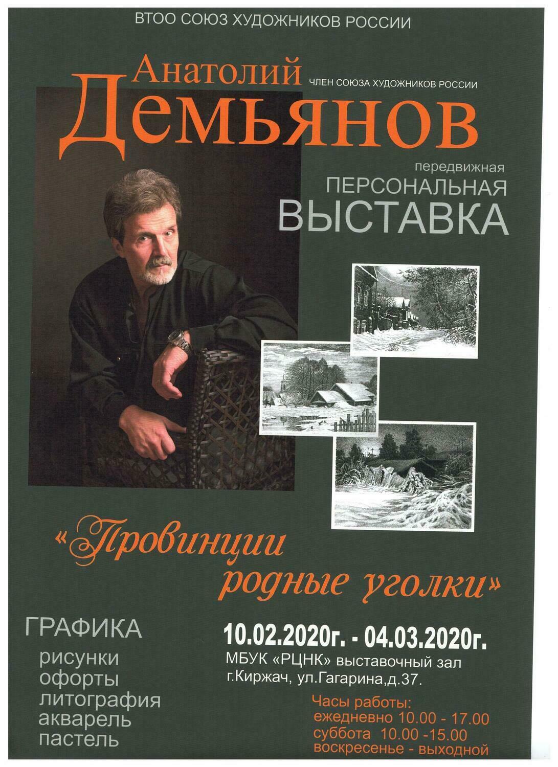 Демьянов Анатолий Иванович (12.10.1959) родился в городе Александров, Владимирской области. График. Окончил Юрьев-Польское педагогическое училище в 1979 году. Член Союза художников России с 1996 года. Член Международной ассоциации изобразительных искусств АИАП ЮНЕСКО. Участник областных, зональных и всероссийских выставок. Работы находятся в коллекции Магаданского краеведческого музея, музея-заповедника "Александровская Слобода" и частных коллекциях России, США, Франции, Израиля, Германии. Работы художника в качестве иллюстраций представлены в историко-литературном альманахе "Александровская слобода" в 1988 и 2005 годах. Наиболее успешно работает в технике графики (литография, офорт).